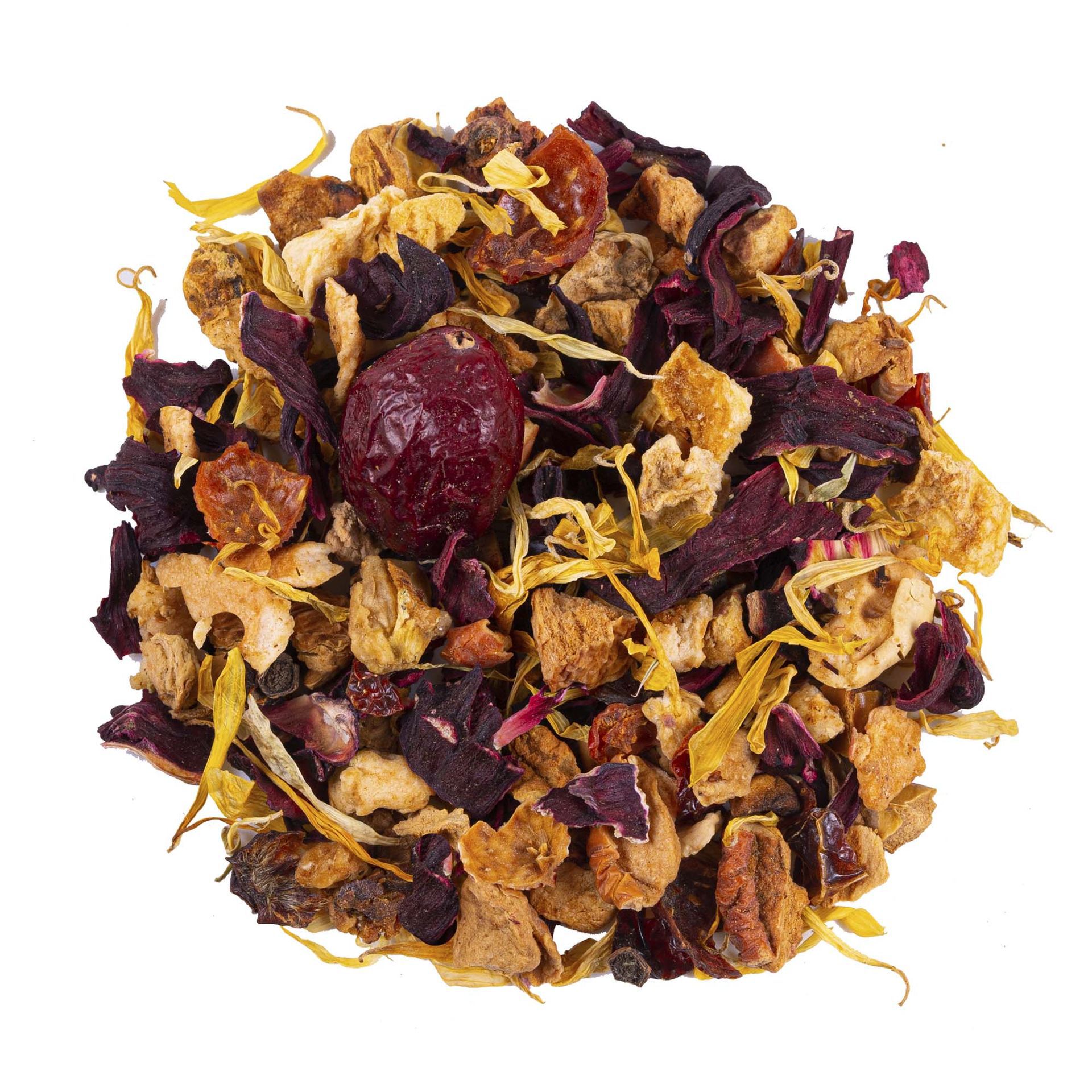 Pomme, Rooibos naturel, hibiscus, cynorrhodon, fleurs de souci, arôme naturel de pêche, canneberge, pêche*, arôme naturel de canneberge.