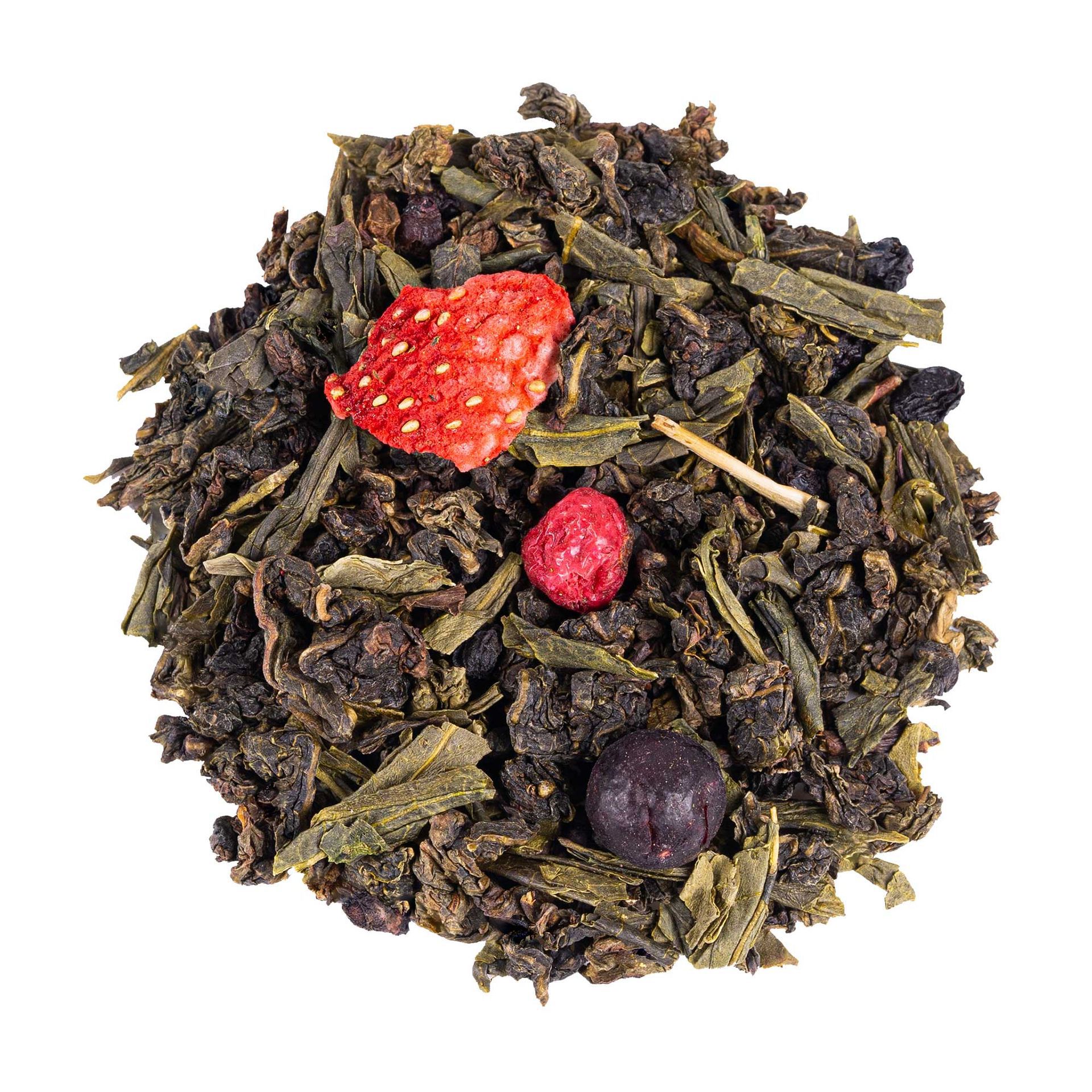 China Oolong* (70%), thé vert China Sencha, baie de sureau, fraise, arôme naturel de framboise, arôme naturel de cassis, arôme naturel de fraise, cassis, groseille, mûre.