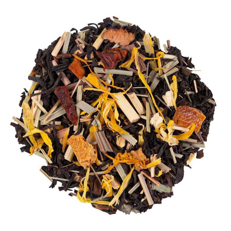 Thé noir Assam, -Inde du Sud, citronnelle, pomme, arôme naturel de mangue, gingembre, papaye, morceaux de mangue, fleurs de souci, griotte, ananas, arôme naturel de citron, Huile essentielle de citron vert*.